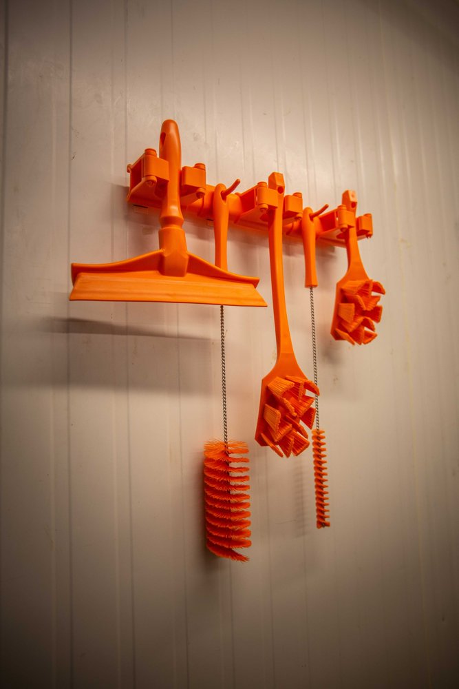 A hygienic, modular wall bracket that provides a flexible solution for storage of your cleaning tool and utensil in any area of your site. The rail is easily attached to the 4 wall mounts by sliding it on from the right or left side. The Grip band modules and Hook modules can then be clicked on the rail and "locked" in place using one of the many small "notches" in the rail. These ensures that the modules can not slide from side to side. 1-10 hanging modules can be placed on the rail. (Max. 5 Grip band modules or Max. 10 Hook modules). The Grip band module can hold products with a diameter of 28-33 mm. The Hook module can hold products weighing up to 3 kg. The system is supplied with 3 Grip band modules and 2 hooks. Modules and rails are easy to disassemble for cleaning or replacement.