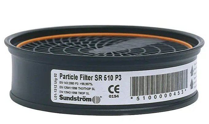 Particle filter SR 510 P3 R, for use in fan SR 500 or in Sundström's half or full face masks. Completely newly developed, with large filter surface and very low pressure drop. Designed to cope with the high air flows provided by the fan. Protects against all types of particles, both solid and liquid. With a separation efficiency of 99.997%, it is one of the most effective particle filters on the market. Used separately or together with a gas filter.