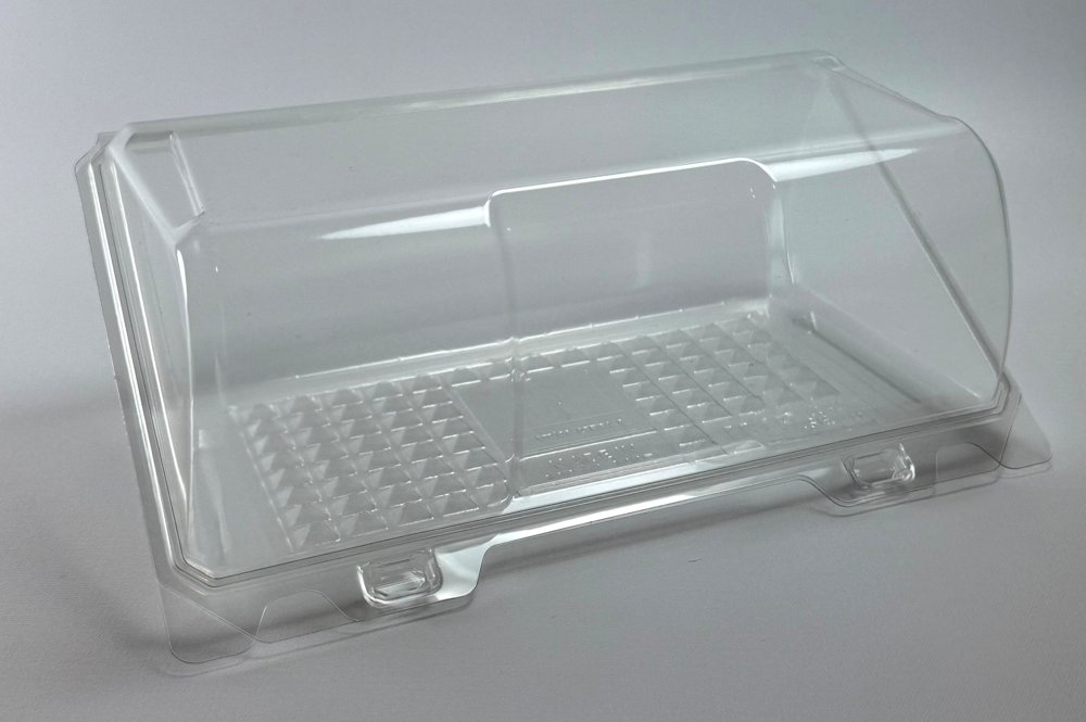 Bakery box made of 100% R-PET. Internal dimensions 195x100x80mm.