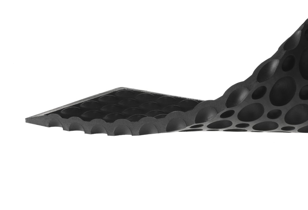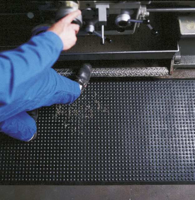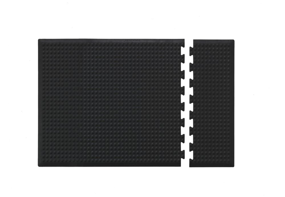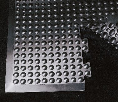 Yoga Flex Industri is made from nitrile and natural rubber; the especially dense rubber compound makes it difficult for bacteria to gain a hold. The nitrile rubber content means it is able to withstand oils, grease and chemicals while making the mat highly hard-wearing and heat resistant. Modular system consisting of centre and end pieces that fit together to the preferred length; also available as a full size mat 60 × 90 cm. The round bubbles on top of the mat stimulate your feet and improve blood circulation. Worn-out modules are easy to replace and the mat can be extended or reduced as required, which is cost-effective.