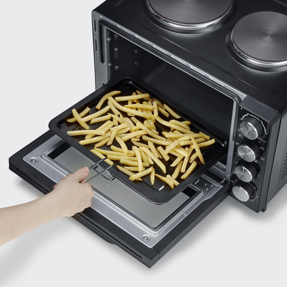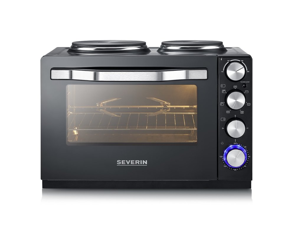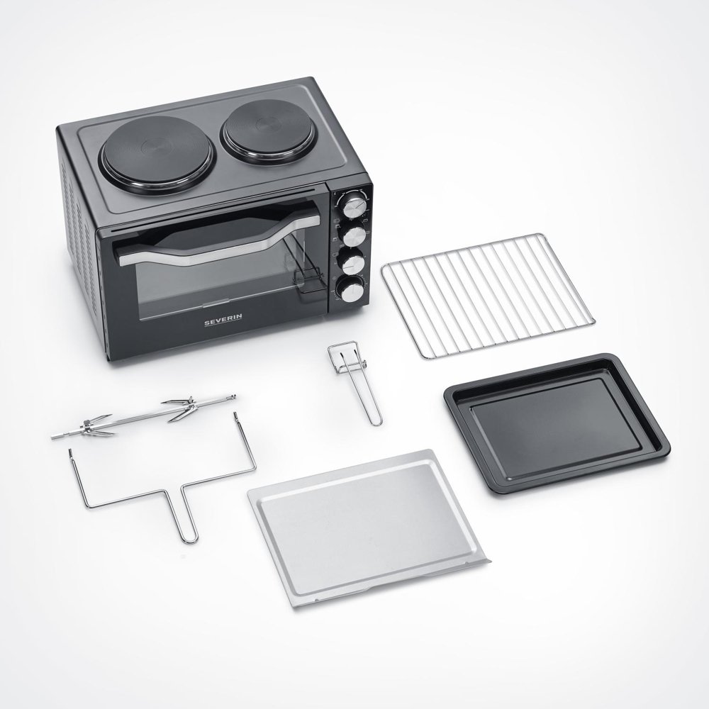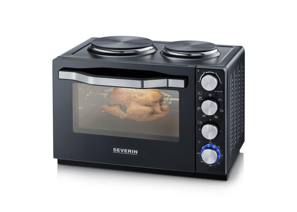 Countertop stove in a stylish black design. Plug in the plug and you have a functional cooking area. Two cast iron hotplates and a 30 liter oven. Works perfectly in all types of accommodation. Approved according to the latest EU requirements. The oven has a hot air function for efficient and good cooking. If you want a nice grilled chicken, there is a rotating grill spit that makes the chicken golden brown and crispy.
