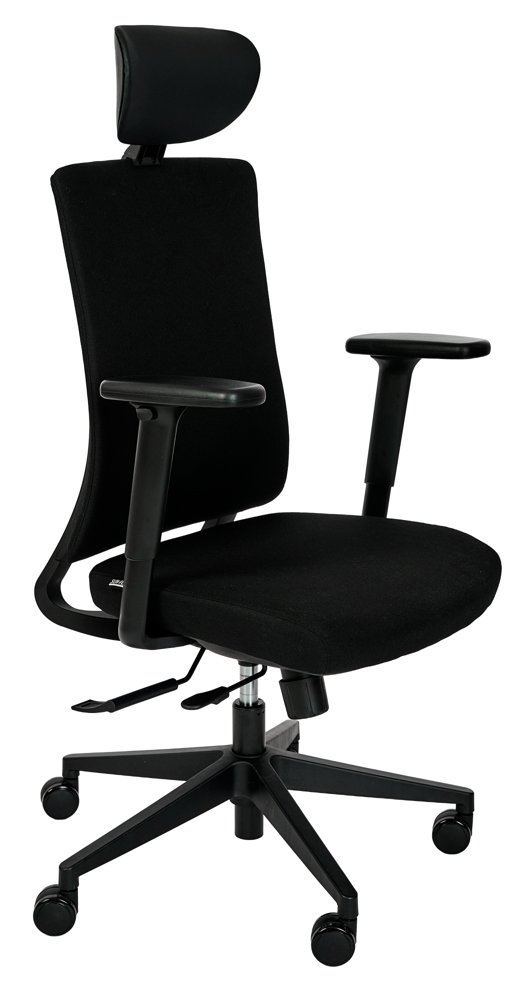 The office chair has a comfortable seat and backrest with absorbent padding and durable fabric upholstery that can withstand daily use in demanding office environments. The adjustable lumbar support and flexible rocking function provide good support for the back and encourage movement, which reduces strain during sedentary work.