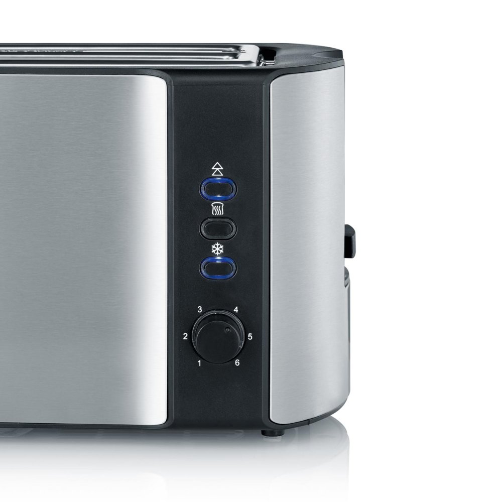 Toaster in a stylish stainless steel design with space for 2 slices. The toaster has smart functions such as a crumb tray, stop button and keep warm. There is also a fold-up rack that you can fold up and warm buns on.
