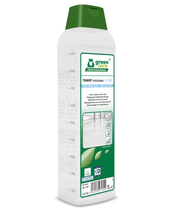 TAWIP vioclean zero% is a floor cleaner with extra caring effect and outstanding environmental properties without containing perfume or dyes. Takes biological cycles into account, protects human health and the safety of cleaning staff. While improving work safety, TAWIP vioclean zero% ensures perfect cleaning results at low concentrations. The natural coconut oil soap in the composition protects the floor from leaching and leaves a protective film with an antistatic effect, as well as reducing the risk of slipping in accordance with DIN 18032-2. ESD-approved!
