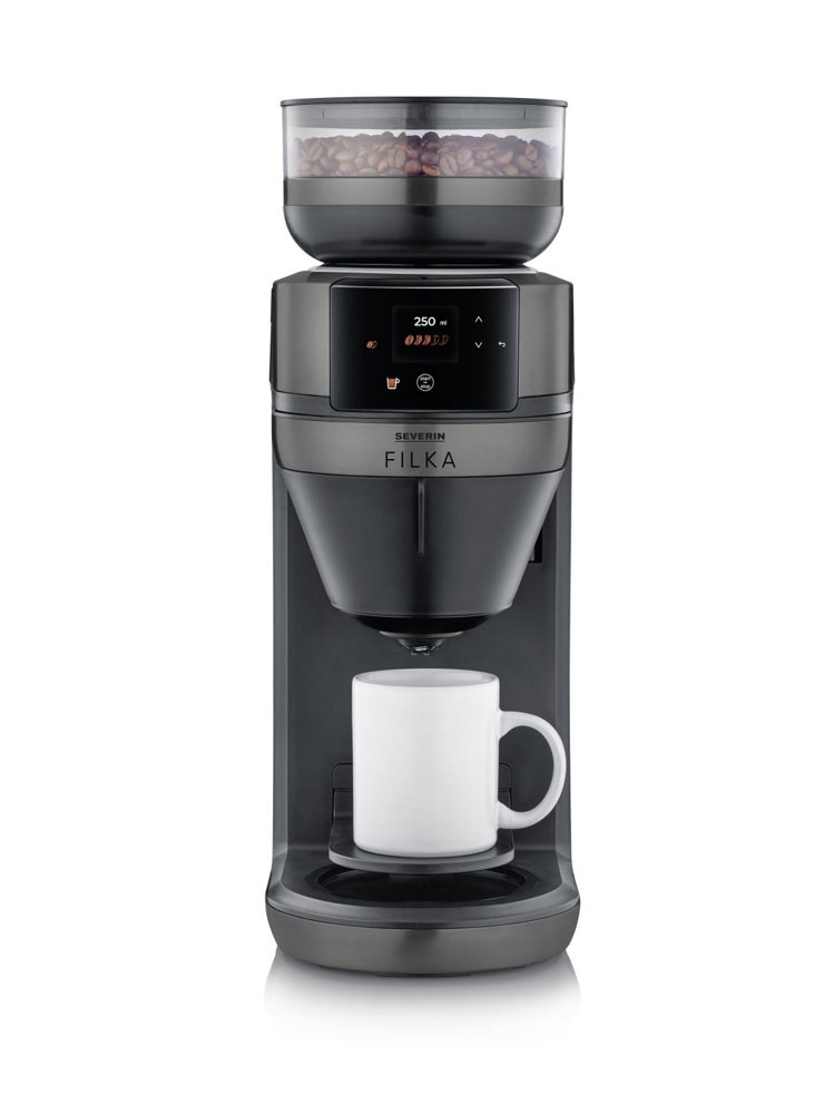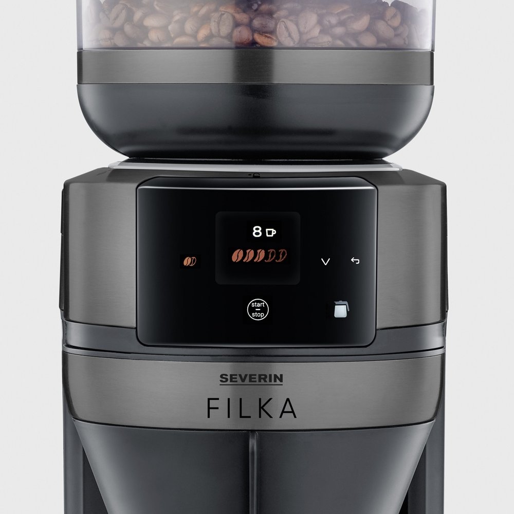 All your choices are made easily in the updated graphic display on the front of the coffee maker. You can choose between several cup sizes and coffee strengths, and if you run out of coffee beans, you can also choose to dose pre-ground coffee. In addition, FILKA has a timer function that allows you to enjoy your coffee whenever you want without having to wait.