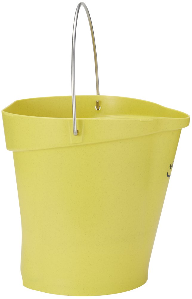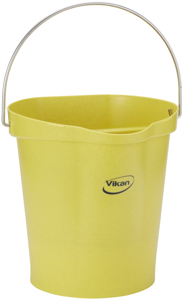 This metal-detectable bucket is perfect for transporting hot and cold ingredients. It features a drip-free spout, a handle on the underside for easy emptying, and a sturdy stainless steel handle. The bucket is calibrated with a measurement scale in various units of measurement.