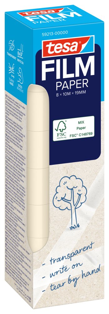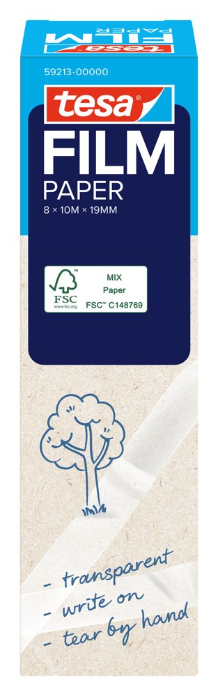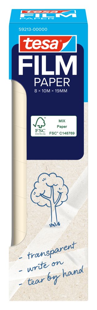 The transparent tesafilm® PAPER adhesive tape is 67% paper-based (excluding core and packaging), perfect for wrapping, securing, labeling, or repairing. It's nearly invisible on light-colored surfaces as well as hand-tearable and can be written on. Made of paper from well-managed, certified forests and other controlled sources.