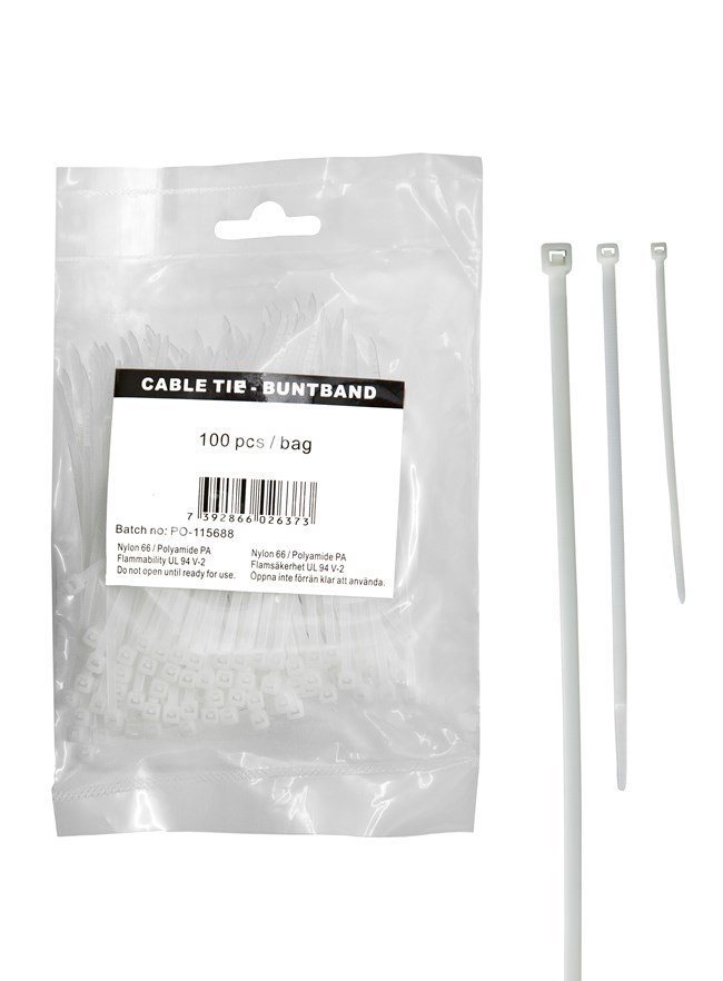 Made of amide plastic. Designed for bundling cables etc. and sealing bags and small sacks.