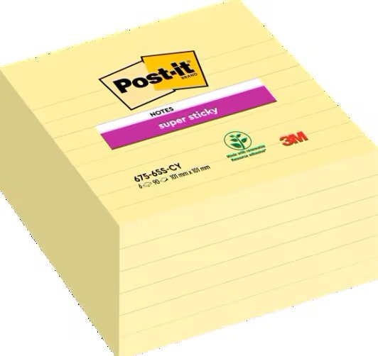 Post-it® Super Sticky Large Notes are stronger and stay in place longer. With twice the adhesive strength of Post-it® Original Notes, you can be confident your message will stick. The classic Canary Yellow Post-it® Notes are perfect for vertical surfaces and hard-to-stick materials. They are lined, great for multiple notes, longer messages, and reminders. Super strong and super flexible, they’re designed to get your message noticed. Made from PEFC-certified paper from certified, renewable, and responsibly managed forests, with an adhesive made from 60% renewable plant-based material that regrows annually.