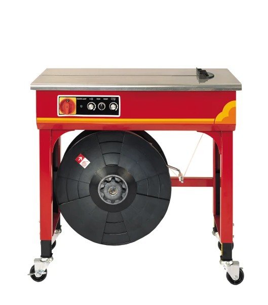 High-quality semi-automatic strapping machine with a simple design. The machine is easy to operate and requires minimal maintenance. Strap tension and strap feed length are electronically controlled. Stainless steel top plate and lockable wheels are standard features.