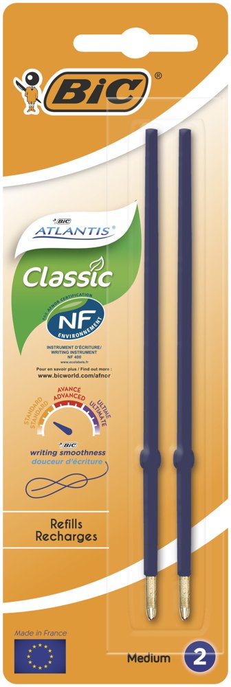 Has your BIC Atlantis pen run out of ink, but you still want to use it? Easy to refill with this refill cartridge: unscrew the end and replace the empty cartridge. The medium 1.2 mm tip is carefully designed to provide an even and steady ink flow that glows up to 35% smoother than the ink in standard BIC ballpoint pens. / The refill for your BIC Atlantis pen comes in either black or blue ink. The 0.7 mm wide needle tip is carefully designed to provide a smooth and steady ink flow that, combined with precision, gives you perfect writing.