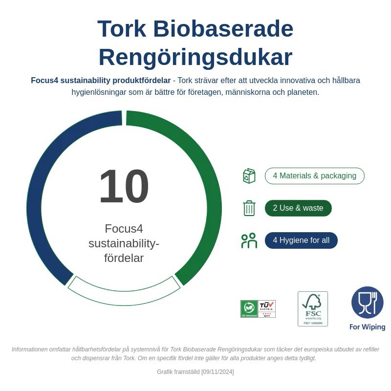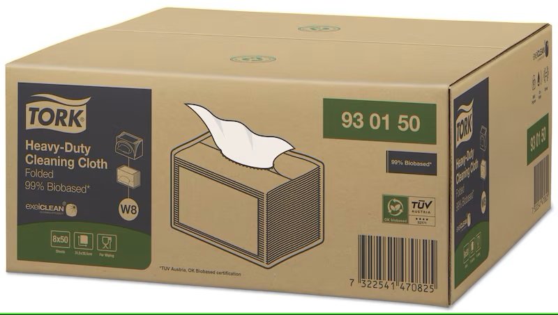 With these cleaning cloths, you handle both light and demanding cleaning tasks in a smooth way. Thanks to the durable material, they can be used for longer, which reduces both costs and consumption. In addition, they are dispensed one at a time, reducing waste as users only take what they need. These cleaning cloths are 99% bio-based and the packaging is made from recycled material. *OK Bio-based-certified product by TÜV Austria
