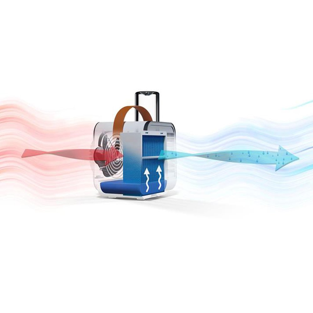 With its convenient carrying handle, the desk fan is always ready to go. It cools and dehumidifies the air using a fan and the evaporation principle.