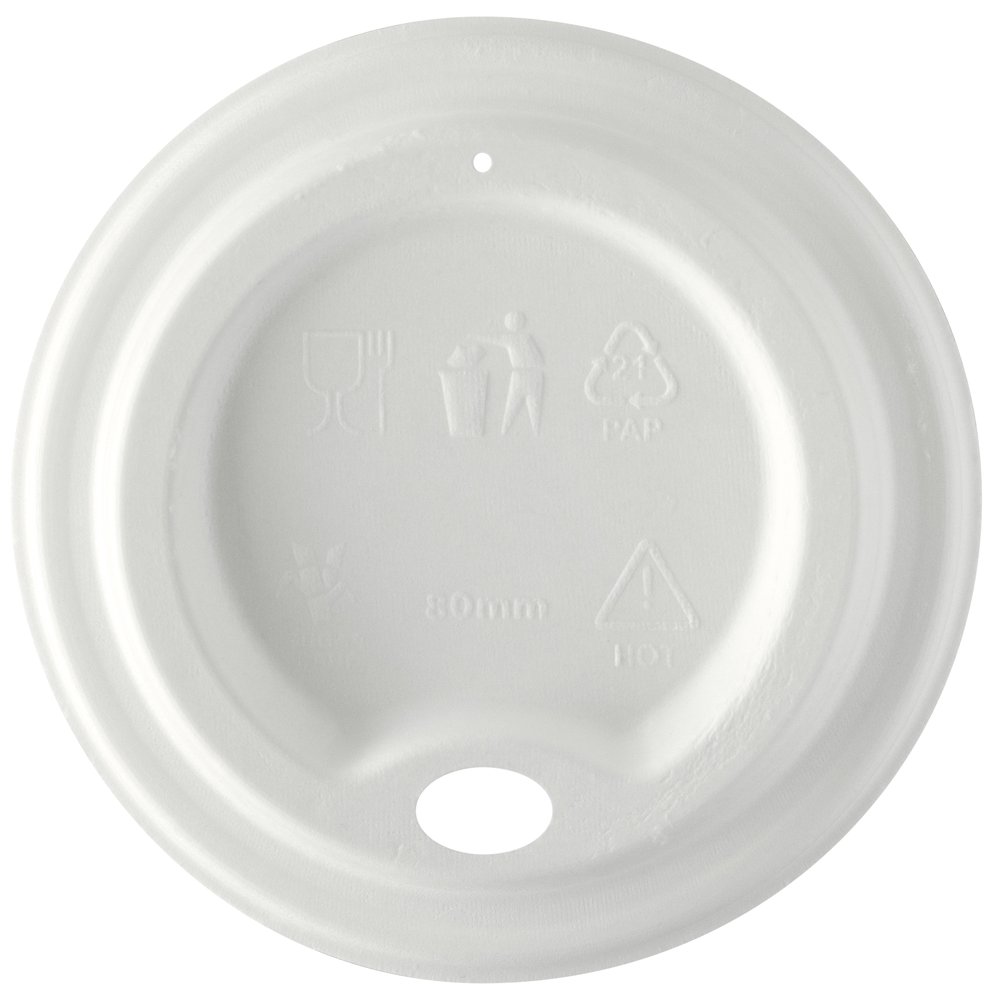 Sip-through lid for Vegware's 79-Series hot cups. A lid for hot coffees or teas to go. Made from reclaimed plant fibre. Off-white colour, embossed with Vegware messaging. Award-winning quality by Vegware, made from plants. Designed for industrial composting, made from recyclable materials.