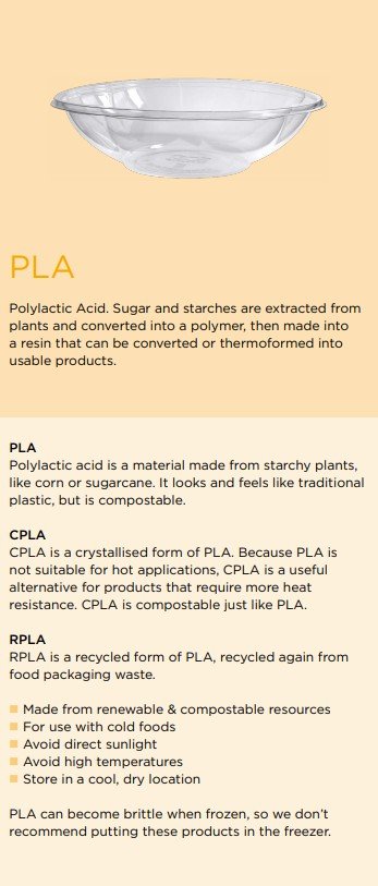 Made with renewable resources. Made from plant-based PLA. Meets EN 13432 standards for compostability.
