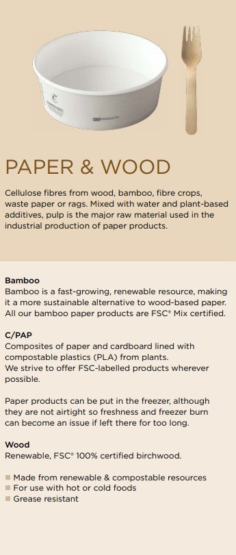 Made with renewable resources. Made from paperboard, lined with plant-based PLA. Hot food friendly Meets EN 13432 standards for compostability.
