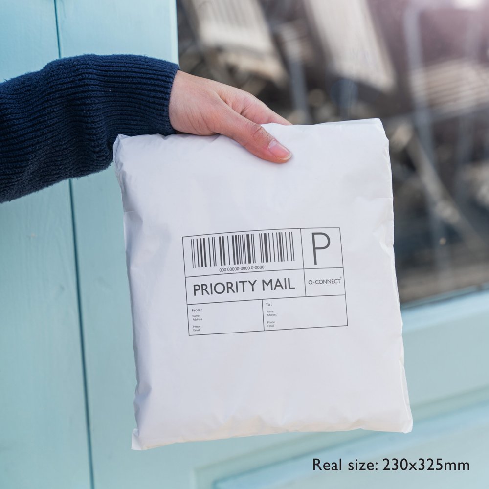 Q-Connect White non-see-through mailing bags with black inside, made from 100% recycled material. 3-layer durable PE film 50mic. The courier bags are durable, waterproof, tear and puncture resistant. They have a strong single strip self-seal closure. Bag dimensions: 230x325mm. Box 100.