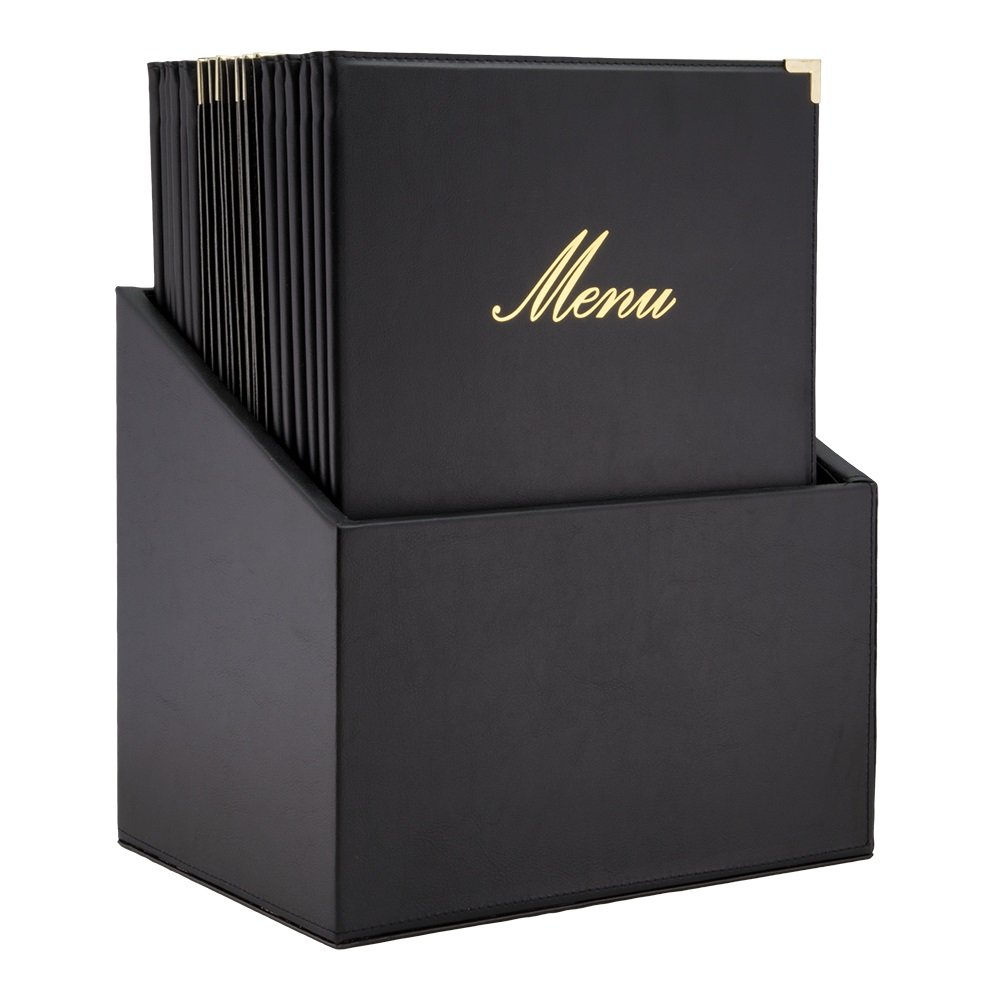 Go classy with the Securit® A4 Classic Menu Holder Box. These hand-stitched, classic leather style menu holders with a gold ""Menu"" print, are perfect for traditional bars, pubs and restaurants. This set of 20 menu holders comes in a matching leather style box and is an ideal solution for keeping your menu holders neat and organised. Featuring metal corner protectors in gold, these menu holders are designed for extensive use. One double-sided insert for 4 x A4 pages is included in each menu holder. Thanks to the elastic cord system, each menu holder can easily be expanded up to 40 x A4 pages by using the Securit® Menu Holder Inserts. The inserts are made of high-quality, environment-friendly polypropylene.